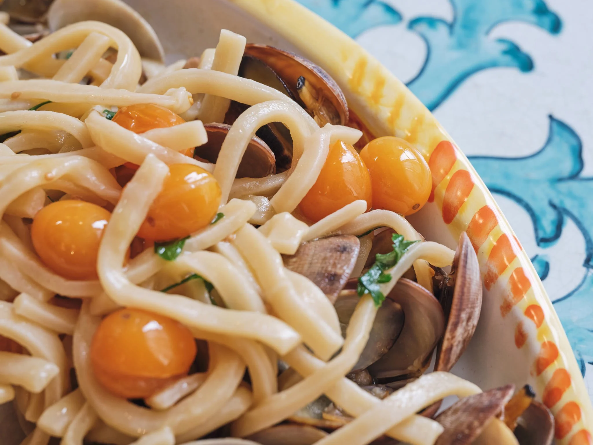 Homemade noodles with clams and yellow tomatoes